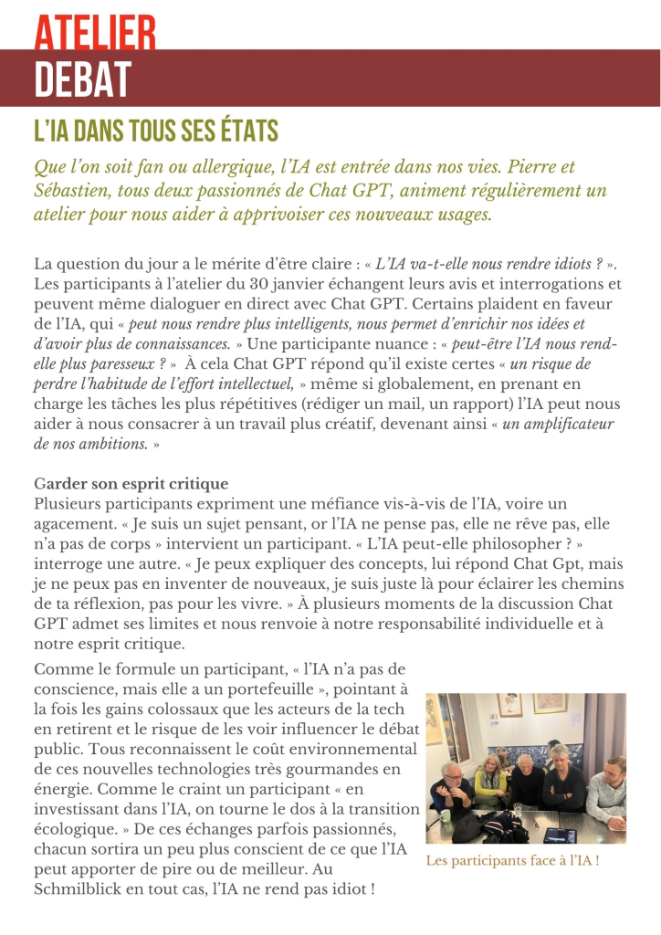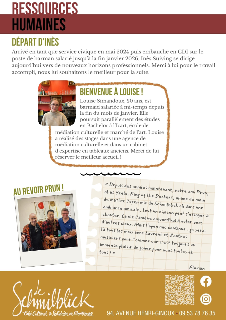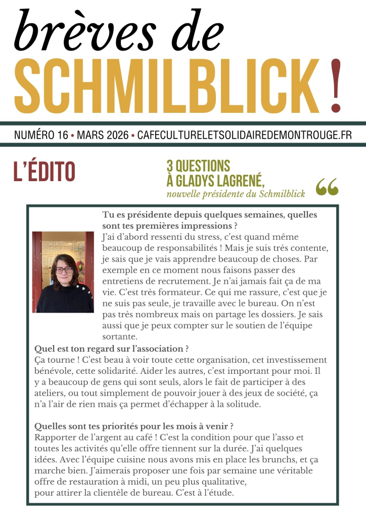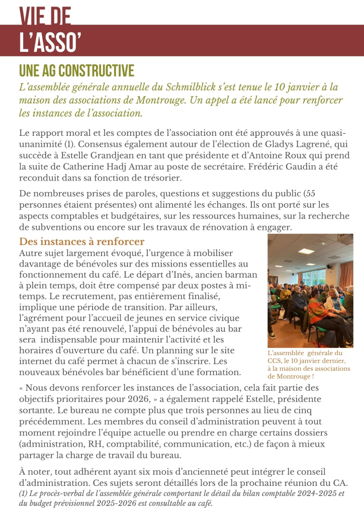 LES BREVES DE SCHMIL' - L'ACTUALITE DE L'ASSO 13 mars 2026 08:48 Par Dominique, mise à jour du site L'actualité de l'association, tous les trimestres